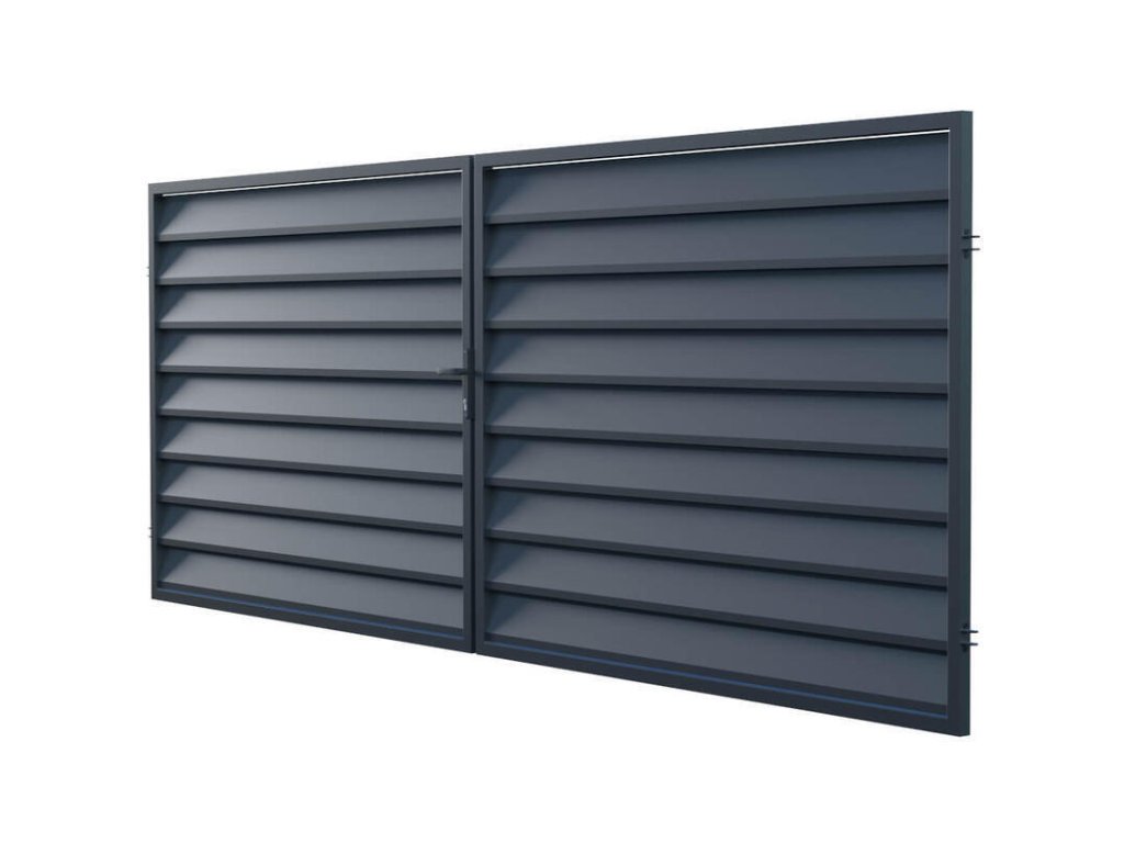Oplocení Mistral, ocelové konstrukce s povrchovou úpravou pro protikorozní ochranu zinkem a matnou antracitovou barvou (RAL 7016), je charakterizováno moderním vzhledem a širokými horizontálními lamelami o šířce 165 mm, které poskytují 100% soukromí. Brána oplocení se pohybuje na kolečkách, její šířka je 400 cm (404 cm s výjimkou) a výška 150 cm, přičemž profil rámu má rozměry 40 x 40 mm. Produkt je dodáván s kováním, avšak bez elektrického motoru.