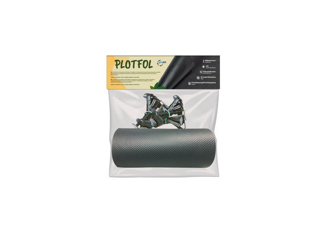 Balení fólie Plotfol, určené pro velkoobchod, obsahuje roli s délkou 50 metrů. Dle technických specifikací má fólie šířku 25 cm a tloušťku 1,35 mm. Součástí balení je také 100 kusů plastových hřebů. Její design je v elegantní černé barvě. Produkty jsou zabaleny s instrukcemi pro použití.